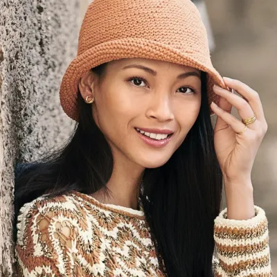 Простая в исполнении шляпка связана платочной вязкой по кругу, а форма изделия зафиксирована с помощью крахмала.