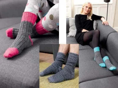 Пряжа (75% шерсти, 25% полиамида; 50 г/210 м) 1–2 мотка темно-серой, 1 моток розовой/бирюзовой/серой/меланжевой; чулочные спицы №2,5.