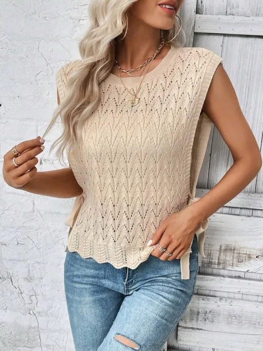 Безрукавка сшивается по плечевым швам. По краю ворота набираются петли и вяжется ворот резинкой 1х1 примерно 4-5 см.Пояс в количестве двух штук (для завязок справа и слева) вяжется резинкой 1х1, набирается 8-10 петель.