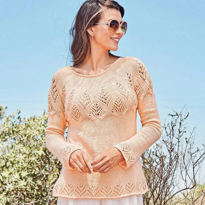 Для вязания этого джемпера нам потребуется 400 (450) 500 г абрикосовой пряжи: 70% хлопок, 30% микроволокно; 140 м/50 г. Прямые спицы № 3,5, а также круговые спицы № 3,5 и крючок № 3.