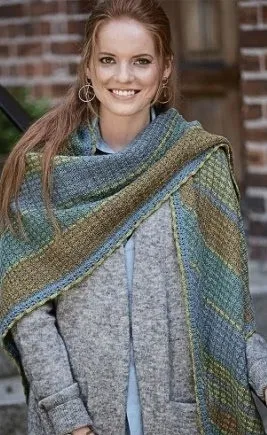 Цветная шаль спицами, связанная из пряжи пяти цветов