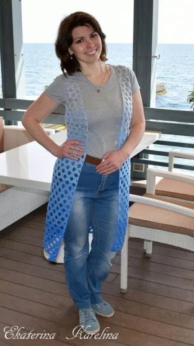 Нитью серо-голубого цвета набираем 20 петель и вяжем строго по схеме одну из полочек до 27 ряда включительно.По этой же схеме вяжем вторую полочку,приняв во внимание,что прибавки по бокам детали нужно делать зеркально первой детали.Для спинки необходимо набрать 100петель и вязать без выреза горловины ровное полотно,начав делать прибавления с 20 ряда с обеих сторон детали (аналогично полочкам).В 28 ряду соединяем все 3 детали в единое полотно,при этом сменив одну из трех нитей серо-голубого цвета на цвет "небо".Далее вяжем ровное полотно поворотными рядами,не забывая менять одну из трех нитей на другой цвет каждые 10 рядов (то есть один оттенок градиента у нас равняется 10 рядам вязания).С 48 ряда прибавляем количество петель в арочках узора на 1ВП (т.е.всего 7 вместо 6),а количество ССН увеличиваем с 4 до 5.Таким образом к низу наш жилет становится немного шире (дырочки "сот" больше) для хорошей посадки на бедрах.Последний,ярко-голубой,цвет у нас состоит не из 10,а из 16 рядов.
