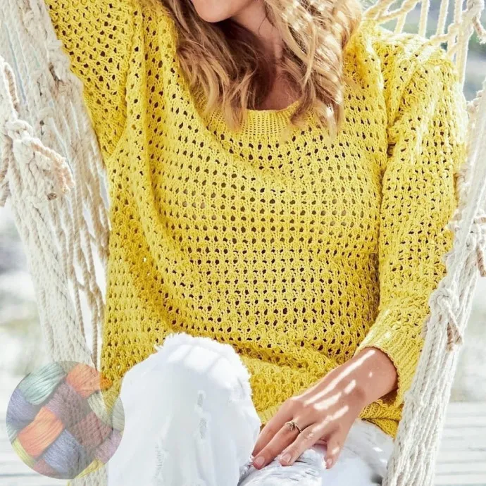 Вам потребуется: пряжа (100% хлопка; 130 м/50 г) – 450 (500–550) г желтой; спицы № 3,5; круговые спицы № 3,25 длиной 60 см; крючок № 3.
