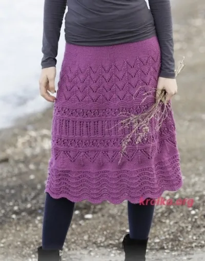 Вяжите по кругу круговыми спицами снизу вверх. Наберите 336-357-399-420-462-504 петель на круговые спицы № 4. Вяжите 2 круга платочной вязкой. Теперь продолжайте по схеме А. 1 (= 21 петля) 16-17-19-20-22-24 раза в ширину. Когда вы провяжите 1 раз вертикально по схеме А. 1 у вас будет = 272-289-323-340-374-408 петель. Повторите раппорт узора по схеме А. 1 еще 4 раза. Помните о плотности вязания. Далее свяжите 2 круга чулочной вязкой, в последнем круге сокращайте петли следующим образом: *2 лицевые вместе, вяжите чулочной вязкой следующие 15 петель*, повторить от *-* 15-16-18-19-21-23 раз = 256-272-304-320-352-384 петель. Вяжите 7 петель чулочной вязкой – Примечание: теперь круг начинайте отсюда. Продолжайте вязать по схеме А. 2 (= 16 петель) 16-17-19-20-22-24 раз в ширину. Размер полотна будет около 17 см. вяжите 4 круга платочной вязкой, при этом сокращая 3-1-3-1-3-5 петель равномерно – читайте совет по сокращению петель 1 = 253-271-301-319-349-379 петель. После этого вяжите следующим образом: по схеме А. 3 (= 3 петли), по схеме А. 4 (= 6 петель) повторяйте раппорт узора до последних 4-х петель круга, по схеме А. 5 (= 4 петли).