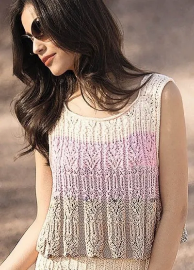 Одновр через 3,5 см = 10 рр от нач р убав для форм трапециевид формы в общ слож 7 пп, для того в 7 изн рубчиках меж ажурполосами = провяз послед 2 пп вм ип соотв = 147 (154) 161 пп.