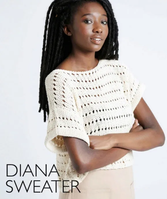 Прежде чем приступать к работе над топом Диана, обязательно проверьте плотность вашего вязания на образце не менее 10 х10 см. В случае, если петель и рядов больше, чем указано, попробуйте использовать более толстые спицы. Если петель и рядов меньше, чем указано, возьмите более тонкие спицы.
