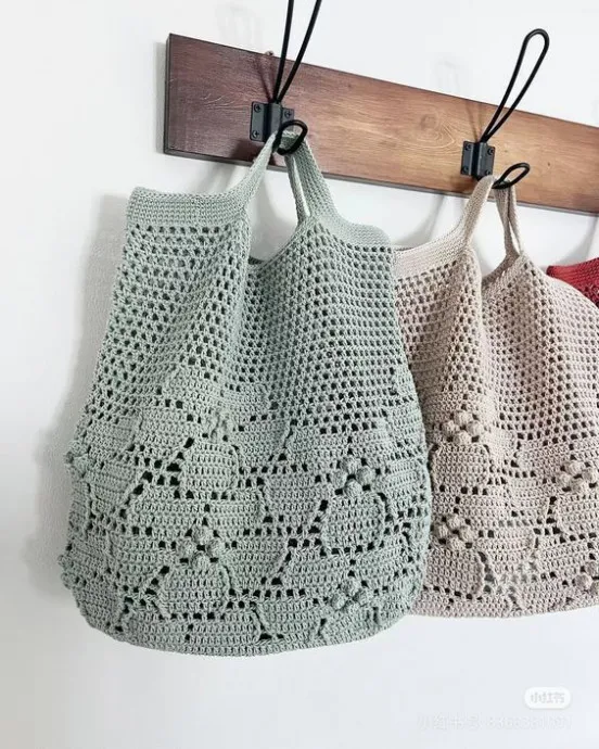 - Цветочный узор придаёт сумке лёгкость и настроение — особенно если он выполнен в технике "бабушкин квадрат" или филейного вязания.