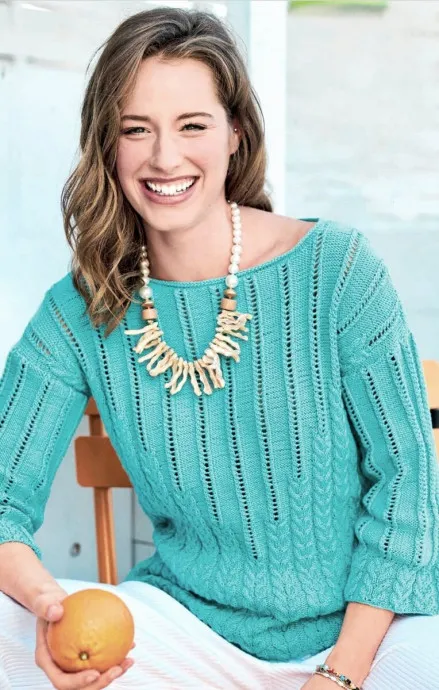 Плотность вязания: 33 п. х 36 р. (= 1-6-й р. схемы) = 10 х 10 см, связано сквозным узором с «косами» на спицах № 3.