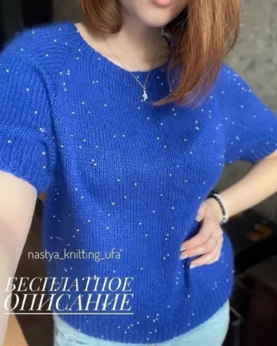 Необычное сочетание: ангора и бусины! Неожиданно для футболки, но смотрится эффектно и интересно. А как вы относитесь к декору в вязаных вещах — бусины, пайетки, вышивка?