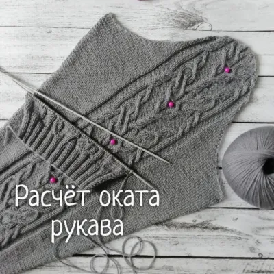 Никогда не придерживаюсь именно расчёта оката рукава. За основу беру выкройку вшивного рукава для изделия из ткани, подходящего по размеру и степени облегания. Рисую швейным мелком окат на доске для ВТО — сама её сделала!!))). Измеряю для верности размер проймы: окат и проймы должны совпадать, сдвигаю вершину оката в сторону полочки на величину ростка. Далее постоянно сверяю выкройку с вязанием! Всё быстро, удобно и просто! По окончании работы просто стираю следы мелка с ткани доски для ВТО.