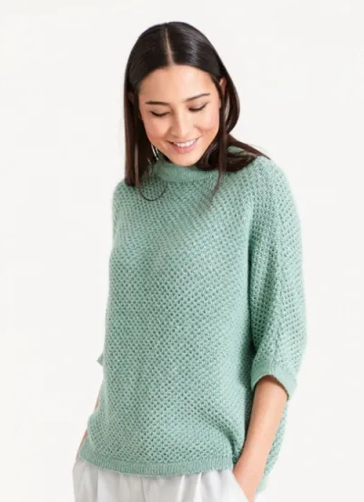 Вам потребуется: 450 (500) 550 г светло-зелёной пряжи Lana Grossa «Lасе Sеtа» (70% альпака, 30% шёлка, 250 м/50 г); спицы № 4,5 и 5,5; круговые спицы № 4,5.