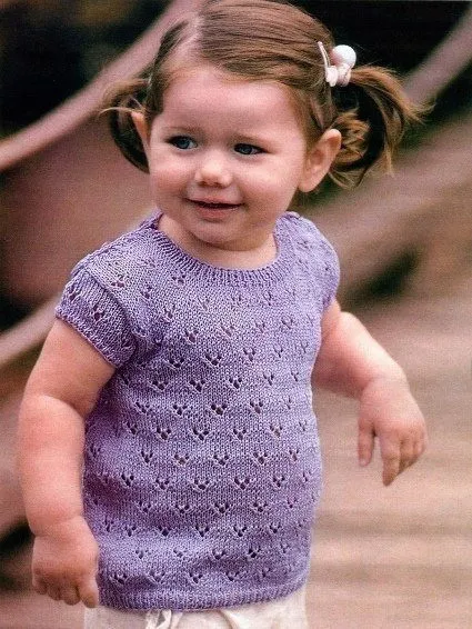 На спицы № 2,5 набрать 83 п., связать 6 р. резинкой 1 х 1 и продолжить узором по схеме спицами № 3. На высоте 20 см закрыть для пройм с обеих сторон по 4 п. и вязать прямо. На высоте 12 см от начала пройм закрыть для выреза горловины центральные 39 п. и продолжить вязание 18 п. каждого плеча резинкой 1 х 1 на протяжении 3 р. На общей высоте 33 см закрыть п. по рисунку.