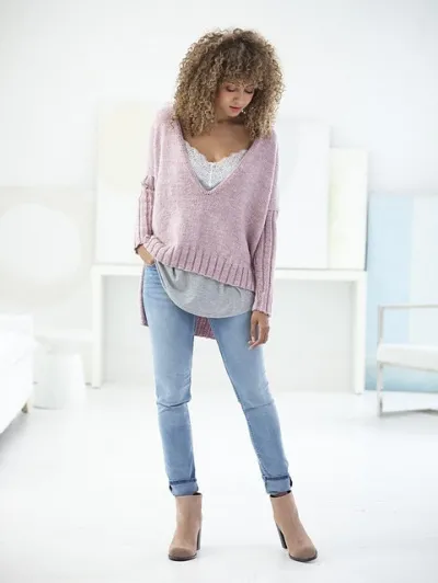 Как вязать стильный женский пуловер с удлинённой спинкой, описание: