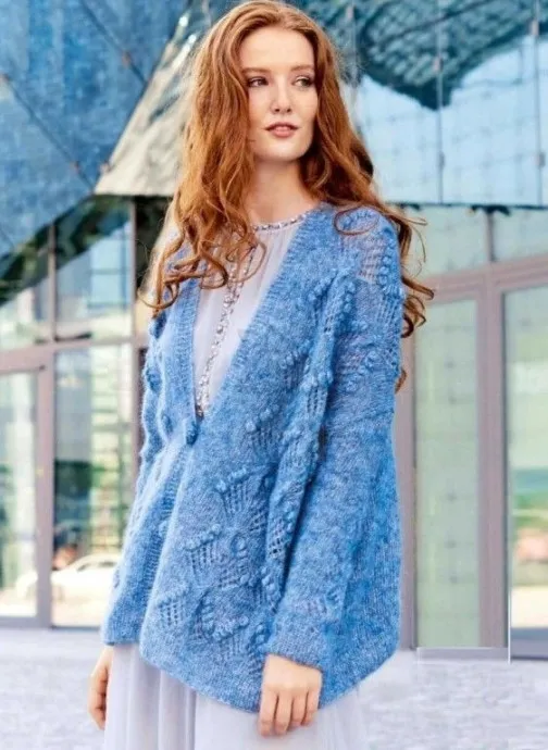 Вам потребуется: пряжа (65% шерсти альпака, 35% хлопка; 150 м/25 г) - 200 (225) 250 г голубой; спицы № 4,5; крючок № 3,5.