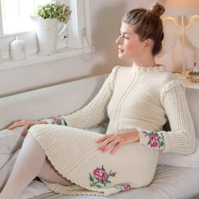 Романтичное вязаное платье, украшенное розами, ажуром и рюшами – воплощенная девичья мечта.