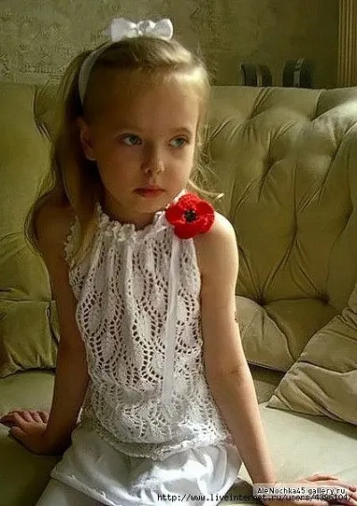 Вяжется топ из двух деталей снизу вверх. Для каждой детали спицами №4 набрать 75п. и вязать ажурным узором. Вверх повторить раппорт 7раз. Связав 2 детали не закрывая петель, собрать на круговые спицы №3 и вязать по кругу верхнюю кайму из дырочек: 2 ряда изнан. гладью, в след. лицевом:1кром, 2вм. лиц., накид...и т.д.,1кром, затем 2 ряда изнан. глади. Все петли закрыть. Сшить боковые швы до нужной высоты проймы. Верхний и нижний край обвязать крючком 1р. ст.б.н, и 1р. пико. Втянуть ленточку. Для того, чтобы каждый раз не завязывать ленту можно в верхней кайме провязать больше изн. рядов и сшить её, получится что-то типа кулиски и внутрь втянуть резинку. Бантик или цветок просто пришить.