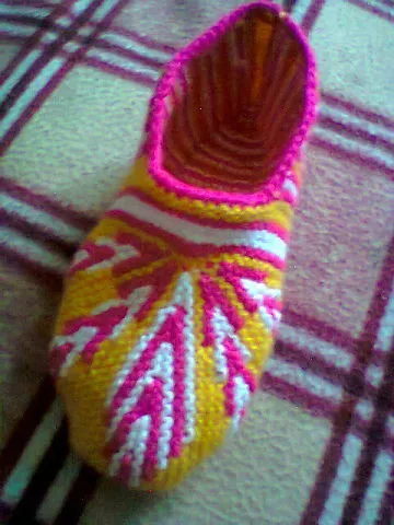 5. Вяжем 5рядов платочной вязкой. Запускаем. По краю полукруга набрать петли ,и на средних связать подошву . 5фото.