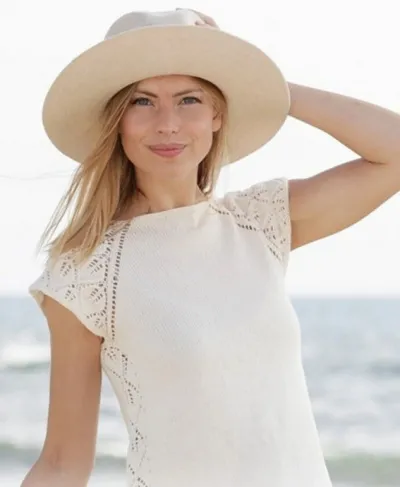 Топ кроя реглан с короткими рукавами, связанный из пряжи DROPS Safran. Изделие связано сверху вниз ажурным узором.