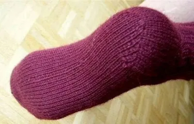 Связав голенище носка желаемой высоты вяжем лицевой гладью петли с 1-й и 4-й спицы, при этом последнюю и первую петлю ряда провязываем всегда лицевой.