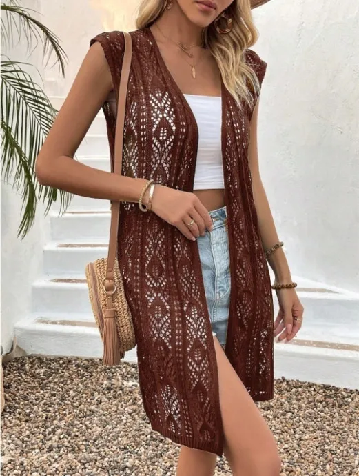 Ажурная вязка придаёт изделию воздушность — в жаркую погоду он станет лёгкой накидкой на топ или майку, а в прохладные дни выручит в сочетании с рубашкой или лонгсливом. Это та самая вещь, которая работает в любое время года.