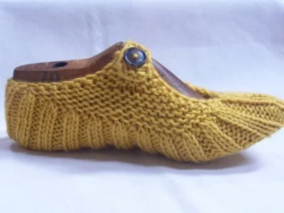 Нужно провязать примерно 30 рядов резинкой, дальше провязываем по две петли вместе где мы их прибавляли, лицевые-лицевой, изнаночные-изнаночной. Теперь переходим на платочную вязку делая убавления в конце и начале ряда (через ряд) пока на спицах не останутся 5 петель. Осталось связать ремешочек необходимой длины, не забудьте сделать отверстие для пуговки, провяжите 2 вместе и сделайте накид, это и будет петелька. Завершительный этап сшиваем тапочек: сложите в двое связанное полотно и зашейте пятку и мысок тапочка, участки вязанные резинкой. Пришейте красивую пуговку, тапочек готов.