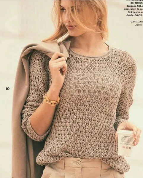 Ажурные узоры всегда популярны! Пуловер с удлиненной линией плеч полностью выполнен несложным, но привлекательным ажурным узором из смесовой хлопковой пряжи. Такой пуловер удачно впишется в самые разные ансамбли благодаря нейтральному бежевому оттенку