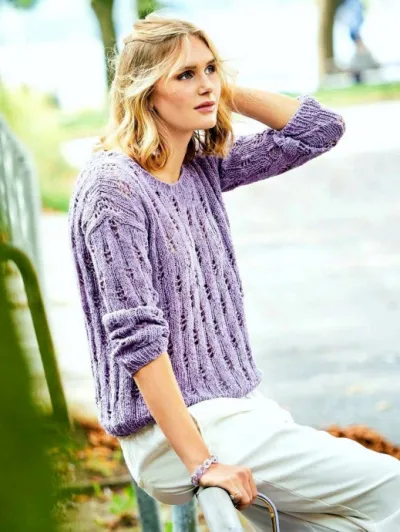 Для вязания нам потребуется 250 (300) 350 г сиреневой пряжи 1 GEDIFRA «Fior di Seta»: 100% шёлк; 165 м/50 г. И 100 (125) 150 г светло-сиреневой пряжи 2 GEDIFRA «Soffio»: 37% овечья шерсть, 37% шерсть альпака, 26% шёлк; 187 м/25 г. Спицы № 5,5 и круговые спицы № 5,5.