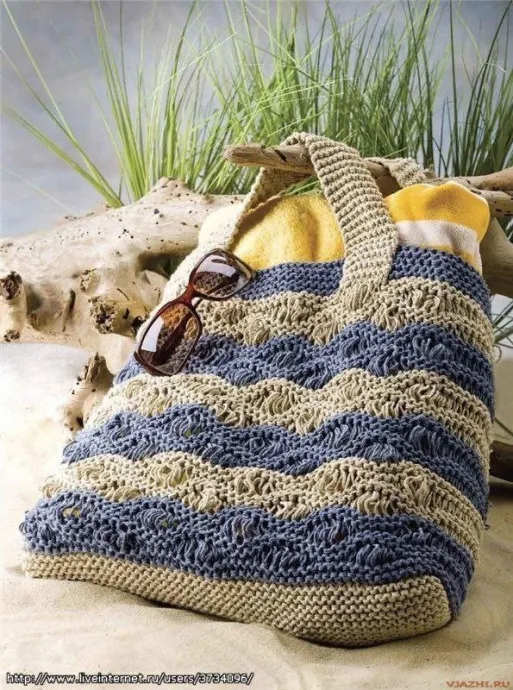 Волнистый узор хорошо подходит для этой пляжной сумки, которая вяжется нитью в два сложения.