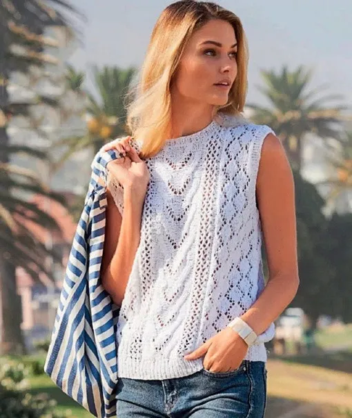 Фантазийный микс из ромбов, сквозных полос и ажурных мотивов означает, что при вязании этого ослепительного топа вам нисколько не будет скучно.