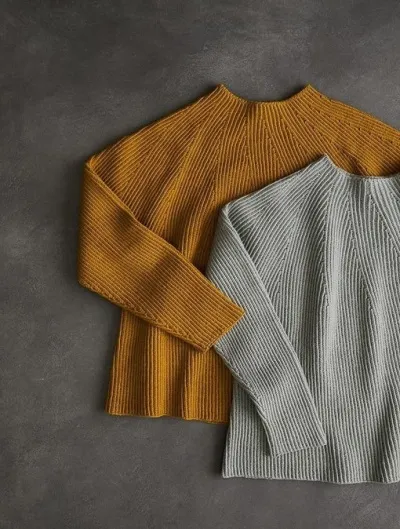 Образцы: серый пуловер цвета эвкалипта 43-го размера, а Желтый пуловер цвета карри 47-го размера, с прибавкой 13 дюймов.