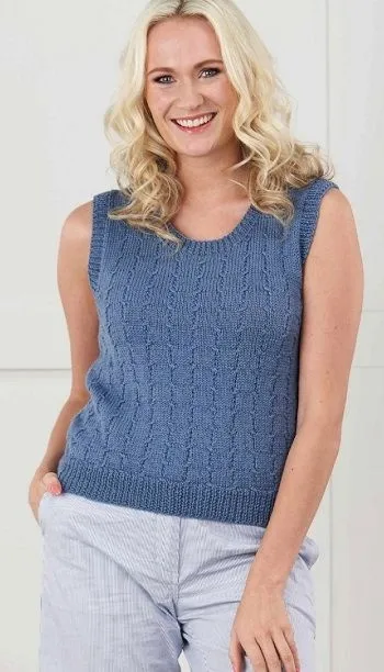 Вязаная безрукавка может послужить летним топом, если выполнить её из другой пряжи.