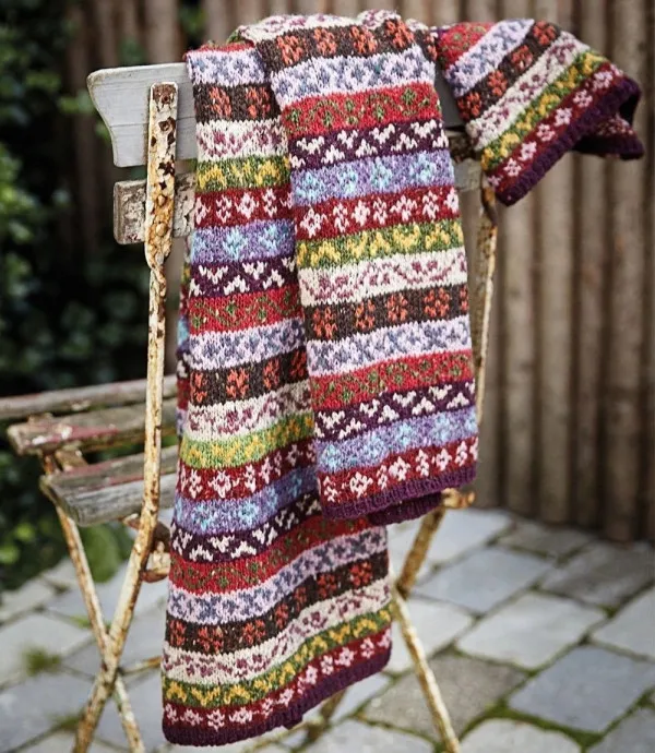 Пряжа (100% натуральной мериносовой шерсти; 50 г/190 м) — 2 мотка баклажановой (№0064), по 1 мотку темно-красной (№0060), нежно-розовой (№0019), горчичной (№0011), оливковой (№0098), светло-оливковой (№0097), ягодной (№0048), бежевой (№0096), оранжевой (№0059) коричневой (№0068), фиолетовой (№0046), красной (№0061), нежно-голубой (№0172) и лиловой (№0045); круговые спицы №3,5 длиной 120 см.