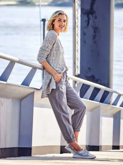 Для вязания нам понадобится 550 (650) г светло-серой пряжи: 45% хлопок, 45% шерсть, 10% полиамид; 150 м/50 г. Спицы № 3,5 и круговые спицы № 3,5
