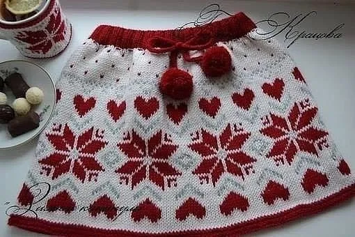 Какая же эта юбка „Зимние каникулы“ — выдумка или сказка? С первого взгляда бросается контраст полос и узор — будто зимняя ночь, опунутая яркими огоньками. А сколько интересных деталей: красный узор, смена цвета, аккуратные убавки, продуманный пояс с резинкой и шнурок с помпонами…