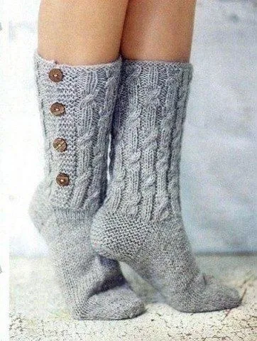 Левый носок: наберите на прямые спицы 51(61)71 п., вяжите прямыми и обратными рядами 3 ряда платочной вязкой. Далее вяжите узором с косами следующим образом: провяжите первые 5 п. ппаточной вязкой, провяжите 1 п. перед раппортом, затем повторите 10 п. раппорта 4(5)6 раз, в конце провяжите еще 5 п. платочной вязкой. Продолжайте вязать петли узором из кос, провязывая крайние 5 п. с обеих сторон платочной вязкой для планок. Через 2 ряда вывяжите первую петлю для пуговицы по правому краю следующим образом: провяжите 1 лиц. п., 2 п. вместе лиц., выполните накид и далее вяжите петли по рисунку. Аналогично вывяжите еще 3 петли для пуговиц в каждом 10(14)14-м ряду. На высоте 16(22)22 см (после того как будет провязан 8-й ряд узора) провяжите еще 1 лиц. ряд, равномерно убавпяя в узоре из кос 5(7)9 п. = 46(54)62 п. Последние 6 п. снимите на доп. спицу и отложите. Разделите оставшиеся петли на 4 спицы - на крайние по 13(15)17 п., на средние - по 10(12)14 п. Спицу с отложенными 6 п. разместите под первой спицей и провяжите их в первом ряду вместе с петлями первой спицы = 40(48)56 п. Разделите на каждую спицу по 10(12)14 п. Смена ряда - посередине задней части носка.