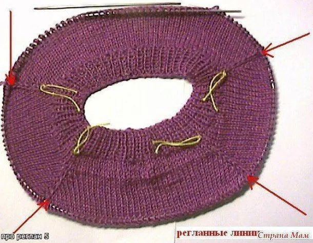 помечают цветной нитью регланные линии и начинают вязать по кругу