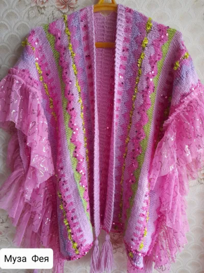 Связала накидку. Шерсть, хлопок, королевские пайетки, ткань сетка с пайетками.