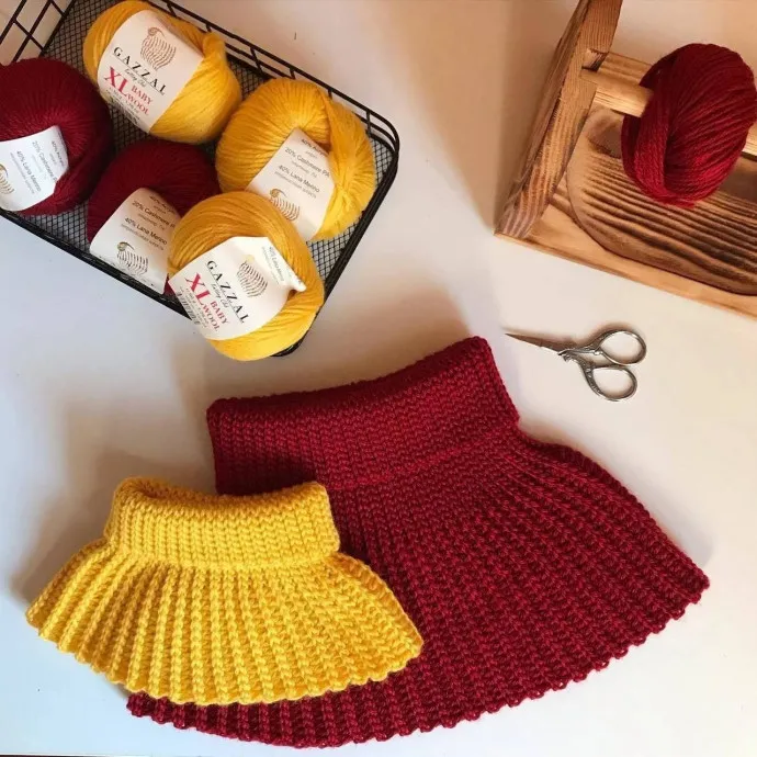Провязываем 110 рядов на обхват головы 56 см. Делаем шов крючком или иглой, стираем, сушим на горизонтальной поверхности, тщательно расправив и растянув юбку манишки.