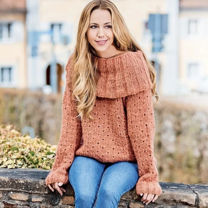 Ажурный узор на основной части свитера получается за счет петель, вытянутых из нижнего ряда.