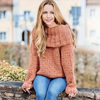 Пряжа (32% полиамида, 27% мохера, 27% шерсти альпака, 14% овечьей шерсти; 125 м/50 г) — 400 (450) 500 г кирпично-коралловой; спицы №5 и 5,5; круговые спицы №5 длиной 60—80 cм.