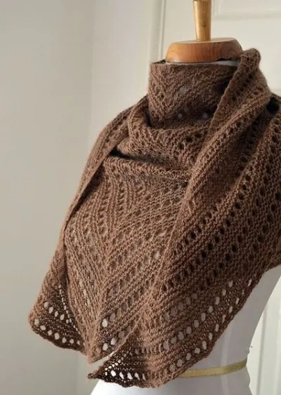 Полосатая текстура платка достигается за счет чередующихся полос платочной вязки и рядов с накидами.