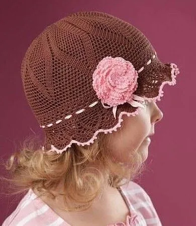 Изящная шляпка связана из остатков шоколадной и розовой хлопковой пряжи крючком №1. Работа начинается с макушки по схеме №1,
