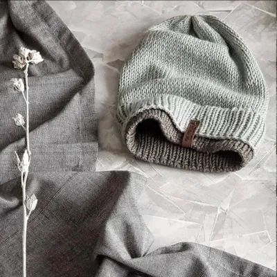 Пройдя 3 этапа убавок(и сменив 2 размера спиц), стягиваем шапочку собирая все петли на хвостик нити, при помощи иглы. И фиксируем макушку. Петель остается не мало, но именно их количество дает приятные складочки при стягивании макушки. Затем берём пряжу контрастного цвета и спицы на размер меньше, чем мы вязали основную резинку. С внутренней стороны шапочки у границы резинки и основного полотна шапки я подняла петли (как для вязаного подклада). И начинаю вязать резинку 1х1.