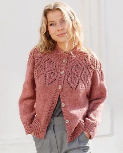Жакет из пряжи DROPS Nepal связан круглой кокеткой с узором из листьев. Размеры: S - M - L - XL - XXL - XXXL