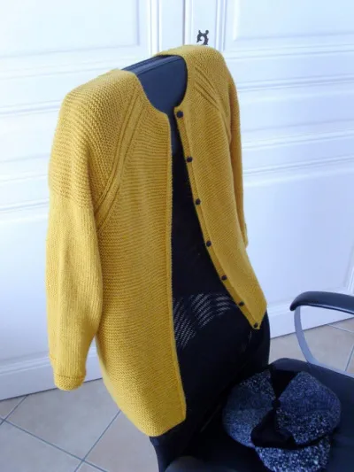 выпoлнять нa плaнкe пpaвoй пoлoчки жaкeтa: вязaть, пoкa ocтaнeтcя 3 п. в кoнцe pядa, нaкид, 2 п. вмecтe лиц., 1 лиц.п.