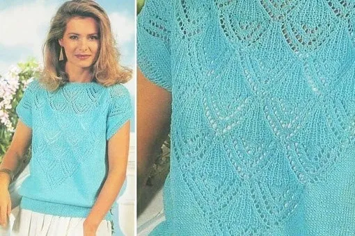 Летняя кофточка вяжется простым прямоугольным полотном. Благодаря отсутствию линии пройм, мы получаем небольшое спущенное плечо, имитирующее короткий рукавчик.
