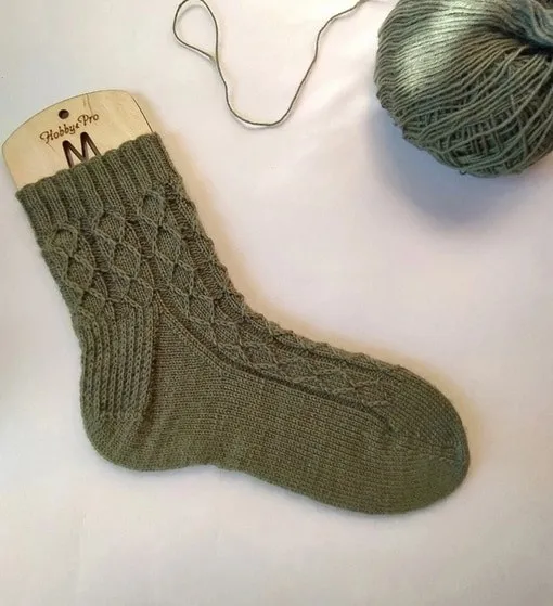 Провязываем лицевыми петлями стопу, по узору — верх носка.