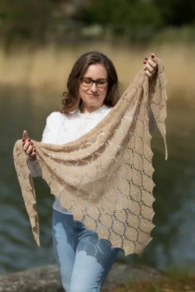Платочная вязка — это когда в каждом ряду вы вяжете все петли лицевыми. Звучит просто, но именно из-за этого узор становится объемным и рельефным. Листочки на шали выглядят очень аккуратно и интересно, при этом не нужно запоминать сложные схемы или переключаться между лицевыми и изнаночными петлями.