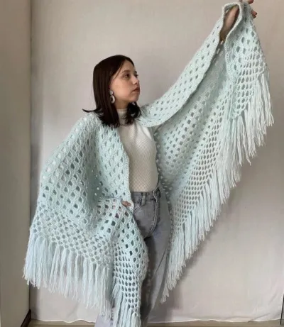Нежно-голубая шаль, связанная крючком, — это воплощение лёгкости и женственности. Она смотрится свежо, воздушно и при этом дарит уют, обволакивая мягким теплом. Такая вещь станет украшением гардероба и выручит в любое время года.