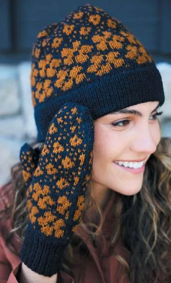 Заправить концы нитей, закрывая ими отверстия при необходимости. Отпарить шапку и варежки.